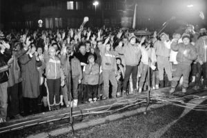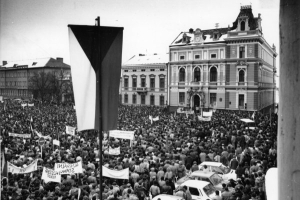 1 (úvodní) Dvouhodinová manifestační generální stávka (12.00–14.00 hodin) dne 27. listopadu 1989 na tehdejším Gottwaldově náměstí, dnešním Masarykově náměstí. Autor fotografie: Ladislav Chvalkovský. Fotoarchiv Slováckého muzea.