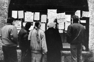 2 Letáková agitace na výkladní skříni staré radnice v Prostřední ulici dne 28. listopadu 1989. Autor fotografie: Ladislav Chvalkovský. Fotoarchiv Slováckého muzea.