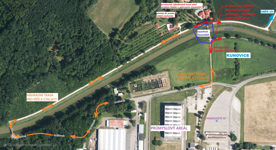 Upozorňujeme, že po dobu stavby bude omezen průjezd po sousedních komunikacích a v blízkosti staveniště. Pro zajištění bezpečnosti budou zřízeny provizorní zúžené koridory umožňující omezený pohyb cyklistů a chodců po obou březích řeky Olšavy. Budou stanoveny náhradní trasy pro pěší a cyklisty, přičemž přes řeku Olšavu se cyklisté a pěšídostanou na následující lávce (Na Záhonech).