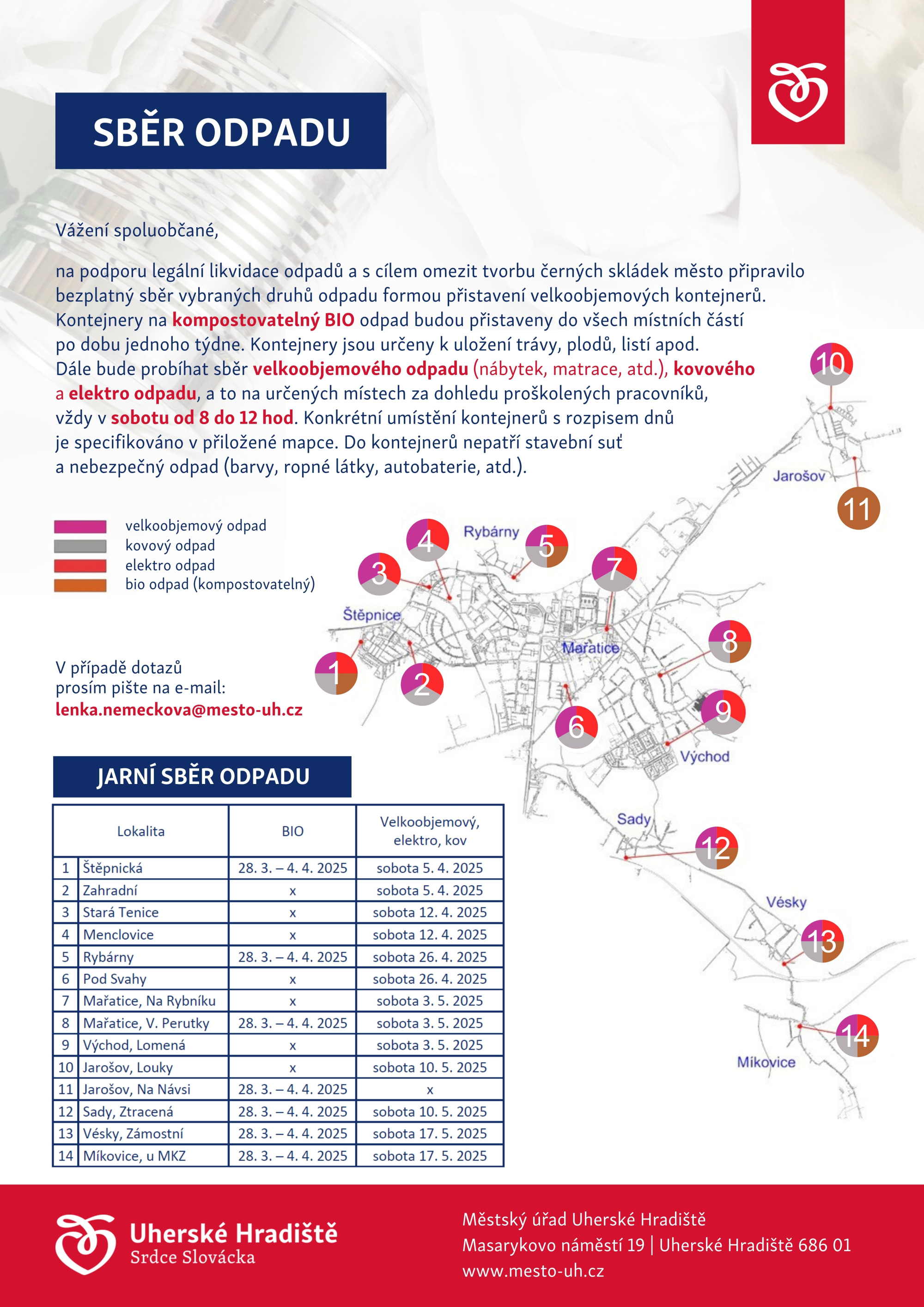 Dále bude probíhat sběr velkoobjemového odpadu (nábytek, matrace, atd.), kovového a elektro odpadu, a to na určených místech za dohledu proškolených pracovníků, vždy v sobotu od 8 do 12 hod.